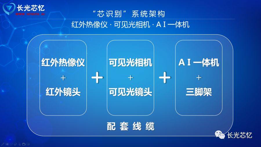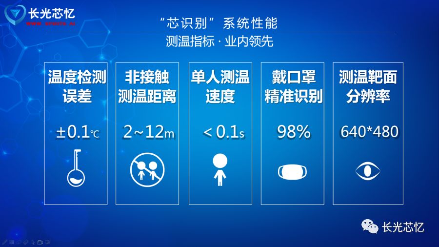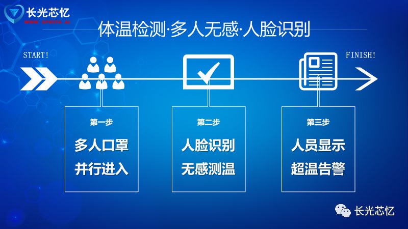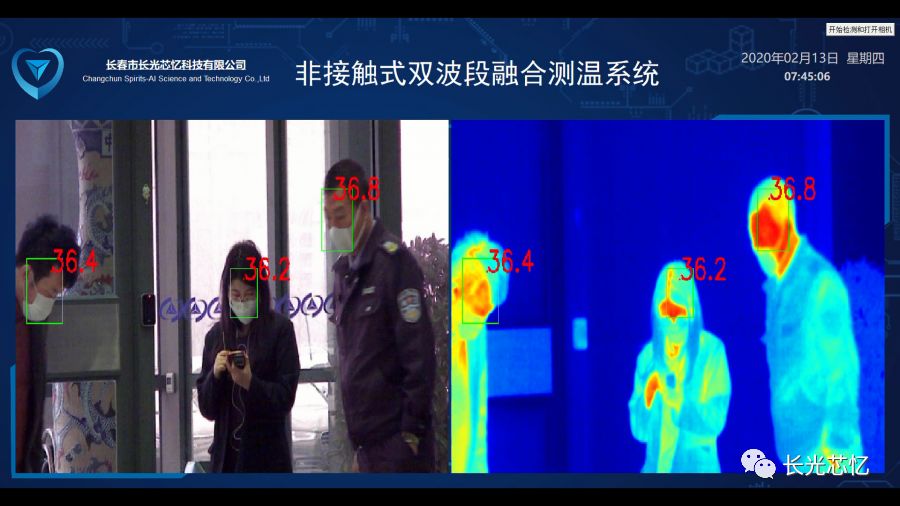 专业丨人工智能测温产品 长光芯忆以人工智能为核心研制的“非接触式AI高精度大范围融合测温人脸识别系统”,其红外探测器选择 航空级大靶面 红外热像仪,通过图像融合技术将可见光图像与红外图像精准匹配,并针对口罩佩戴状态优化识别算法,可智能检测有效区域温度。 当发现有人员体温超过37.2摄氏度时,自动告警,如果该人员在人脸库中,则辅助识别该人员姓名并记录。实现密集人流区域下的大范围非接触式 多人无感并行检测 ,极大提高人员体温筛查效率,减少交叉感染可能性。 是一款融合可见光波段、红外波段、测温功能、人脸检测功能、人脸识别功能以及 戴口罩情况下的人脸识别 功能的智能化安全防疫监控系统。 我和主管聊天的时候说起这个AI智慧测温系统,他表示很怀疑呢,真有那么便捷? 你测温的时候可以和同事一起,一走一过就完成测温;你考勤的时候口罩也不用摘就完成打卡,你说方便不? 高效丨多人并行戴口罩识别